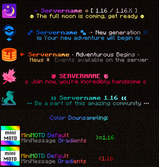 - MiniMOTD supports RGB colors and gradients through MiniMessage, which is also where MiniMOTD gets it's name.