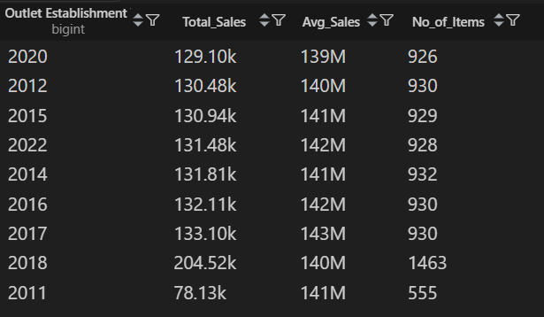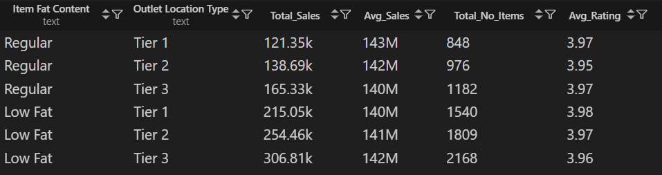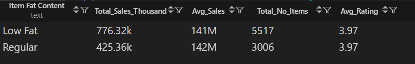Insight: This output segments sales based on fat content (e.g., Low Fat, Regular, etc.), revealing consumer preferences. Higher sales in certain fat categories can inform product stocking and health-based marketing strategies.