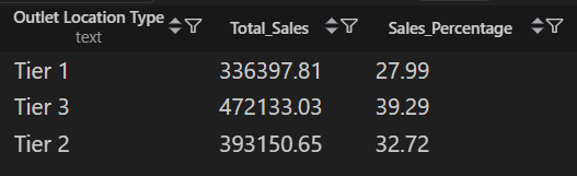 Insight: This output provides a percentage breakdown of total sales by outlet size (Small, Medium, High). It highlights which store sizes contribute most to revenue and can help in optimizing store layouts or investments.