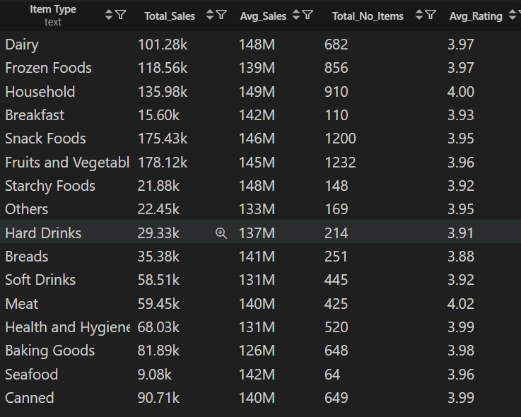 Insight: By analyzing performance across product types (e.g., Dairy, Snacks, Beverages), this result pinpoints high-revenue categories. The business can use this to identify top-selling segments and plan inventory or promotions accordingly.