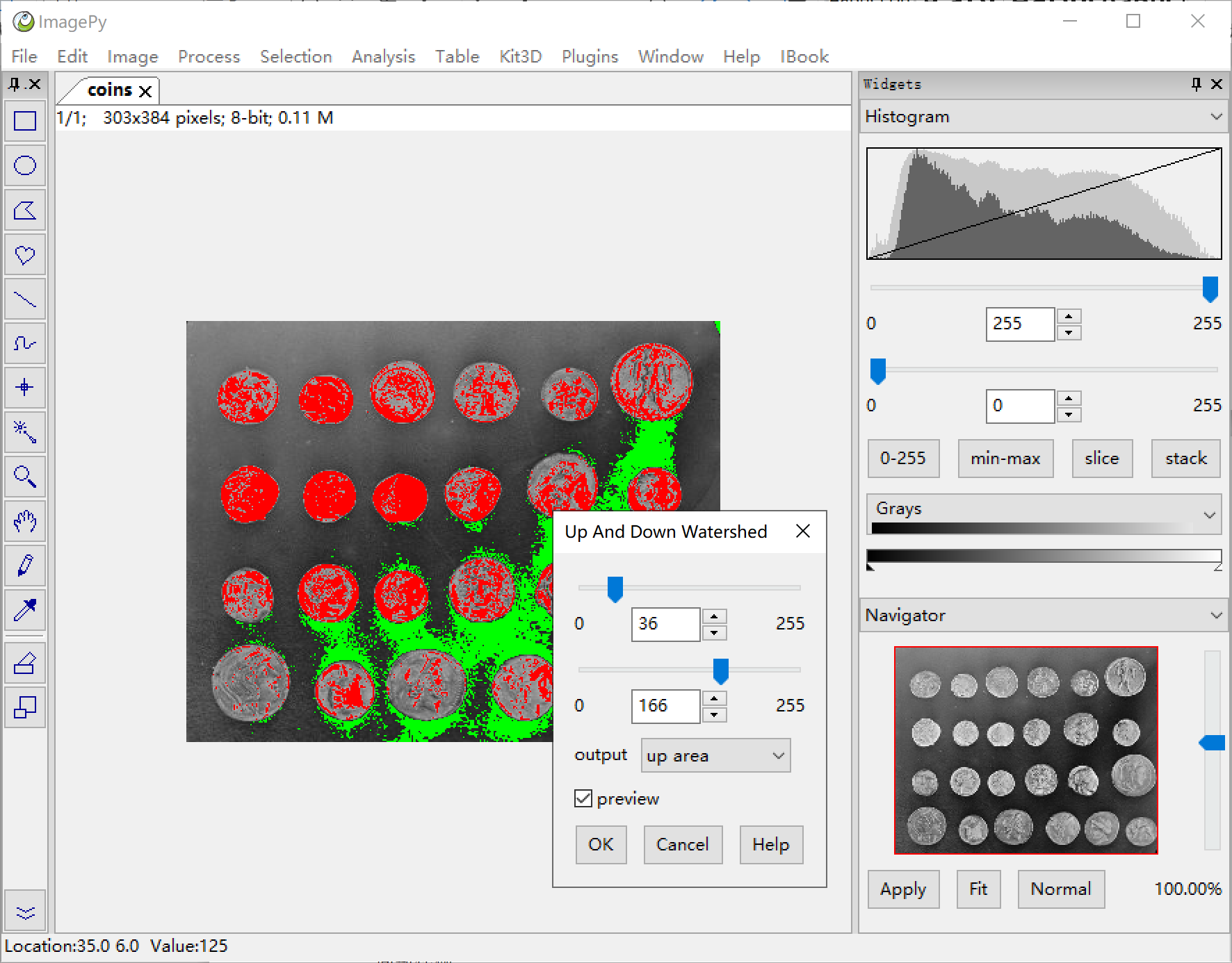 ImagePy has a very rich set of features, and here, we use a specific example to show you a glimpse of the capacity of ImagePy. We choose the official coin split of scikit-image, since this example is simple and comprehensive.