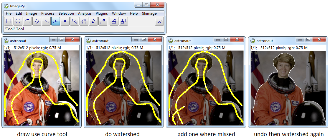 img[msk] = 255ImagePy support ROI, you can use tool to draw a roi(point, line, polygon...), And We can use ips.roi access it, and ips.get_msk(mode='in') to get the roi mask image. mode can be 'in','out',or int means a sketch with specific width. Then use the mask as marker to do a watershed,