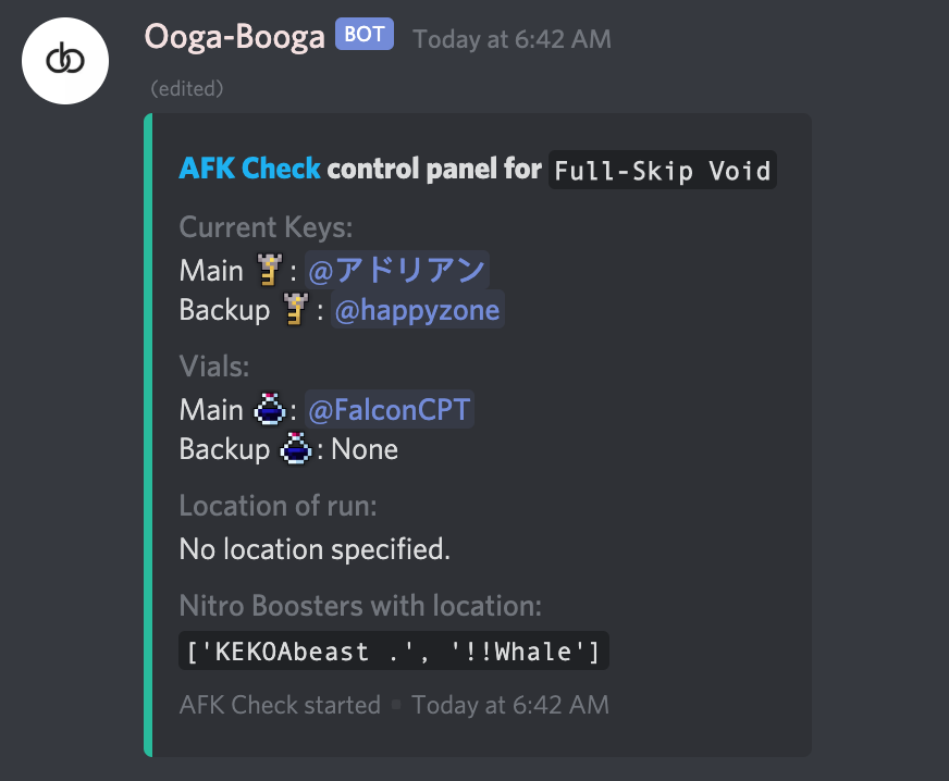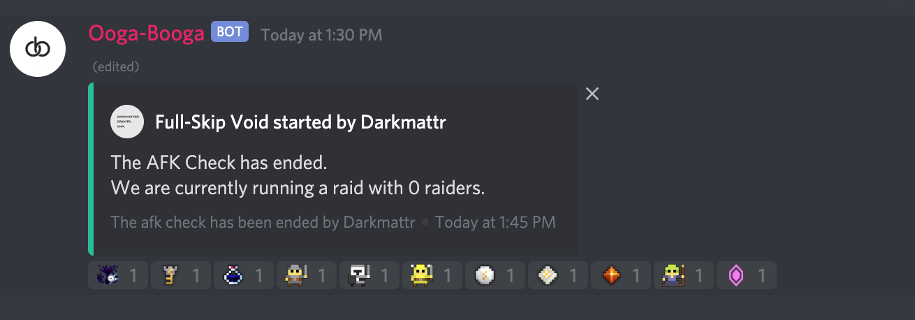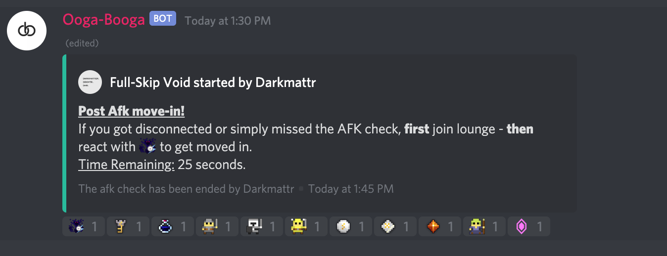 ⇒ Permissions Needed: Same as Afk Checks (Channel Dependent)