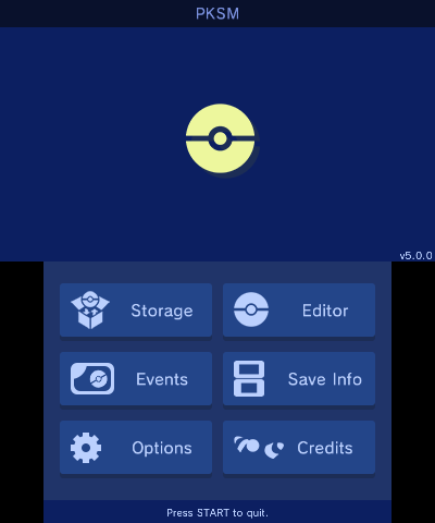 If you're coming from a PKSM version < 5.0.0, you'll notice your bank.bin file isn't recognized anymore. That's because the working path changed from 5.0.0 onwards, so you'll need to manually move your bank.bin file to the new location, from /3ds/data/PKSM/bank/ to /3ds/PKSM/bank.