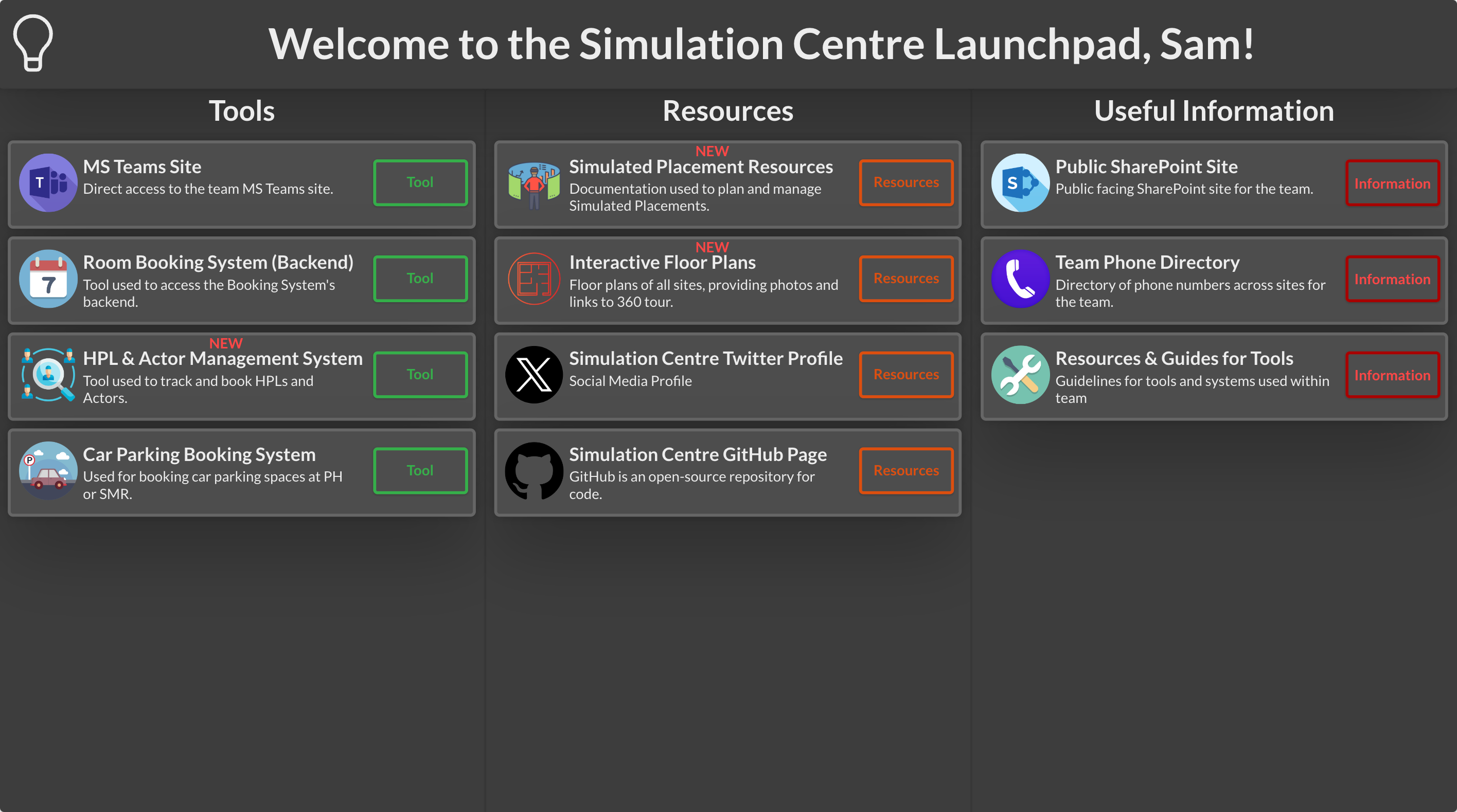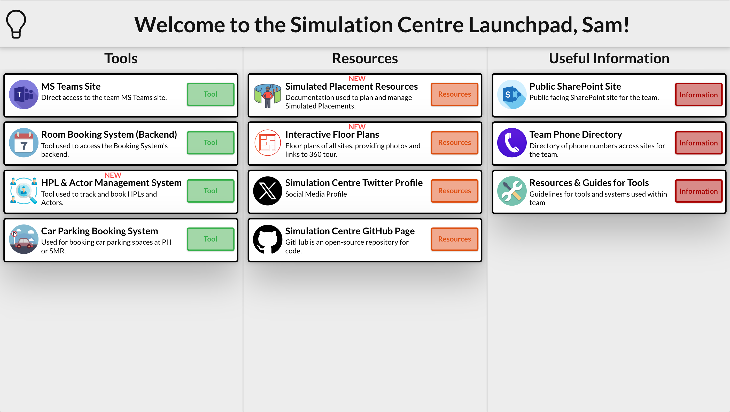 Trying to share resources with staff is often quite challenging. The use of long emails and informational documents creates inequity with people who learn through the use of more modern methods. This application provides an easy-to-use and accessible option for Simulation Centre staff to access important information and resources.
