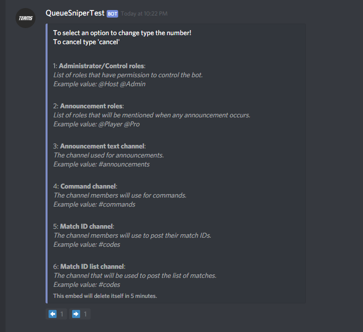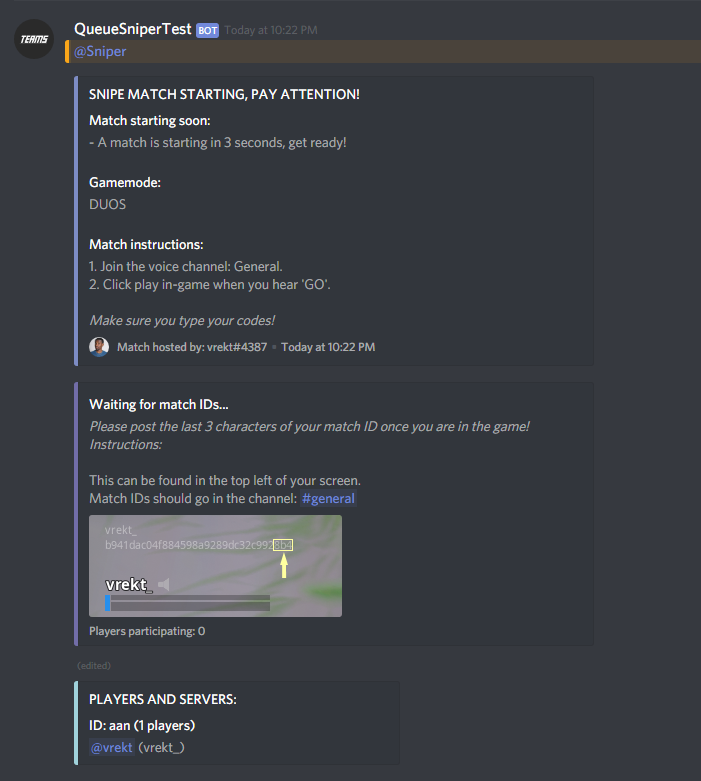 !cancel <gamemode>- Cancels a match that has started collecting codes.!start <gamemode> (optional) #channel- Starts a snipe match, if you specify a channel then all embeds will go there.!lock- Locks a channel!unlock- Unlocks a channel!link <platform> <name>- Allows players to link their Fortnite accounts, this is not verified.!unlink- Allows players to unlink their Fortnite account.- If you are an administrator you can unlink other players account like this