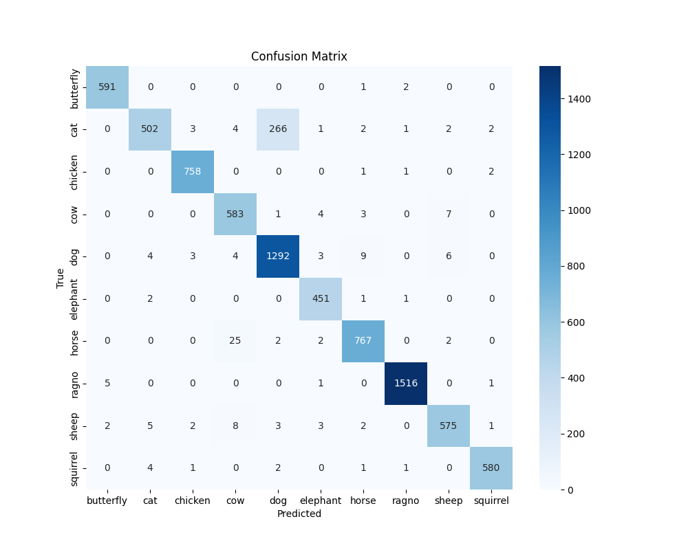 本项目使用深度学习技术对 10 种动物进行分类。我们使用了 EfficientNetV2B0 架构,并对其进行了改进以提高性能和准确率。