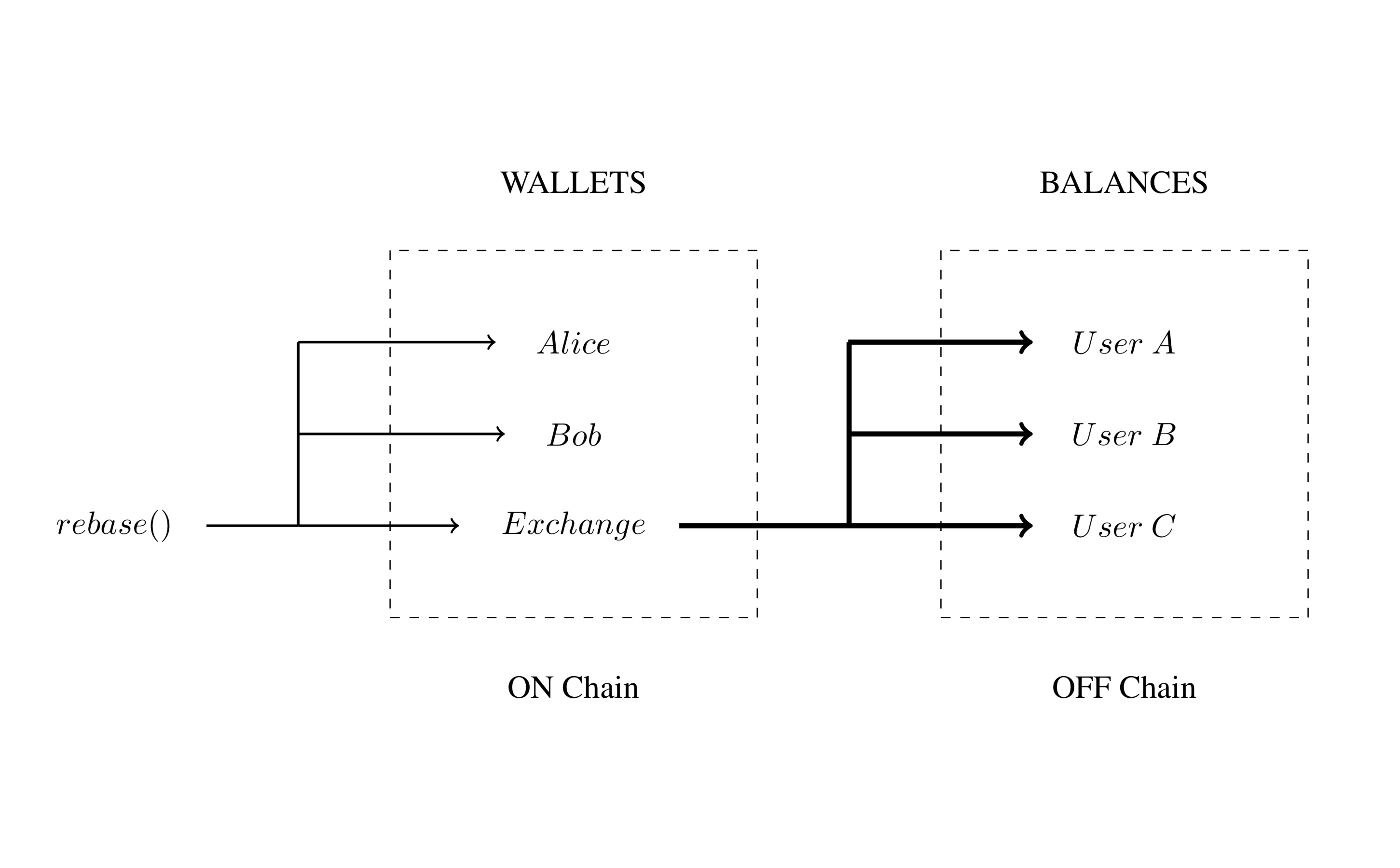 Each time a rebase changes the total supply, all user wallets holding AMPL tokens adjust up or down globally by the same scaling factor. This global balance update happens atomically for all wallets in a single transaction. Ultimately, this means that when an exchange's pooled wallet balance is adjusted, user balances need to be adjusted accordingly.