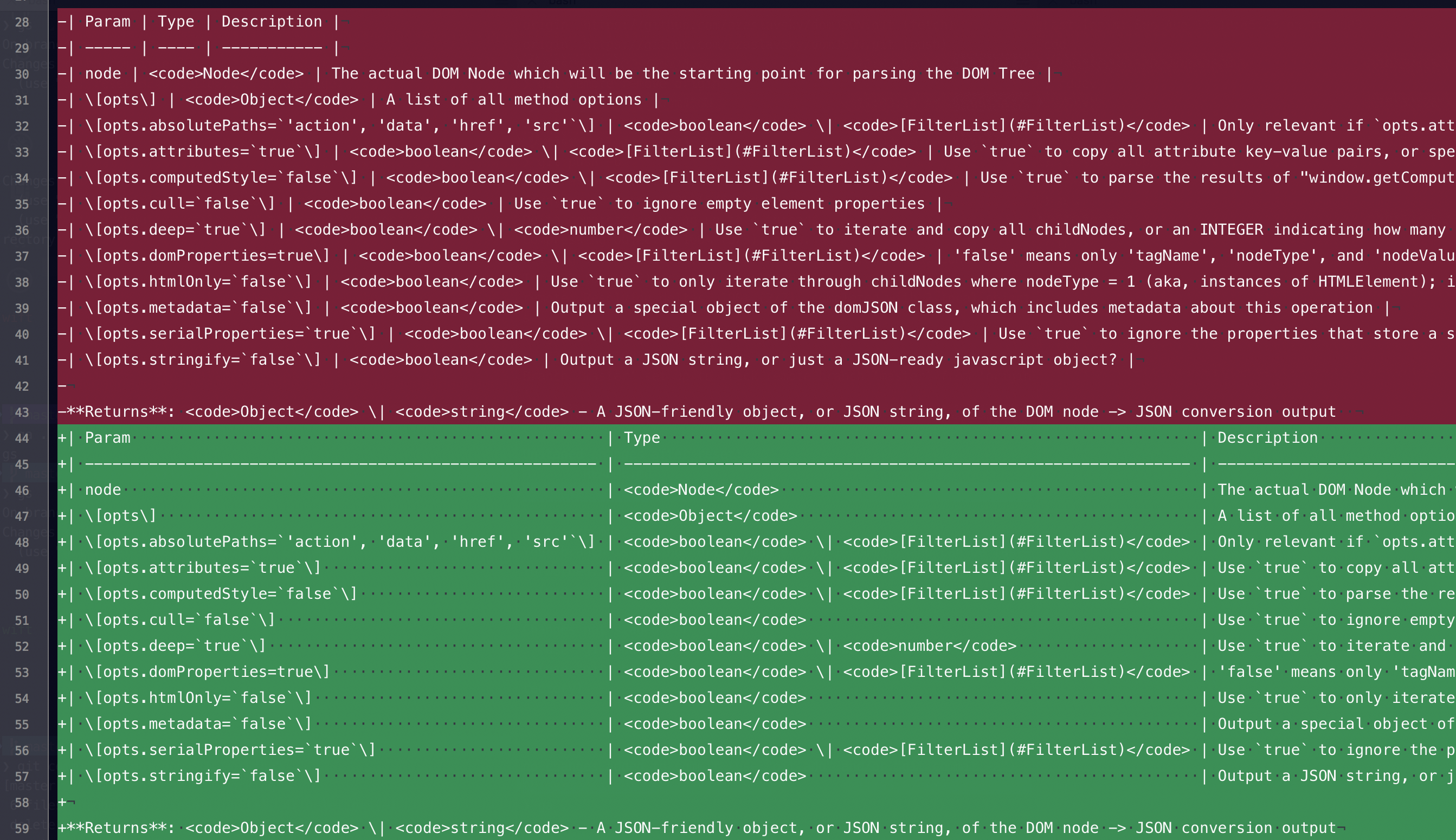 | #### domJSON.toJSON(node, [opts]) ⇒ <code>Object</code> \| <code>string</code> | ||