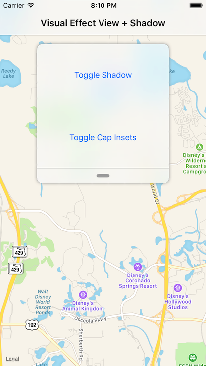 This demo shows how to add a drop shadow to a UIVisualEffectView. The solution involves using/ creating a 9-part UIImage to represent the shadow. The effect is similar to the iOS 10 Maps app.