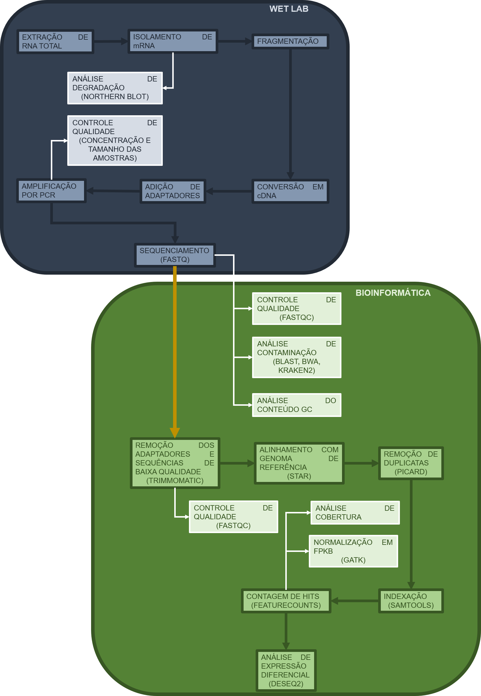 As etapas 1 a 7 consistem de técnicas de análises laboratoriais, enquanto as etapas 7 a 13 consistem de etapas de bioinformática, que serão automatizada no presente projeto através da integração de linha de comando/java/python/R. O projeto ainda está em desenvolvimento, de forma que as etapas finalizadas serão marcadas no seguinte fluxo de trabalho.