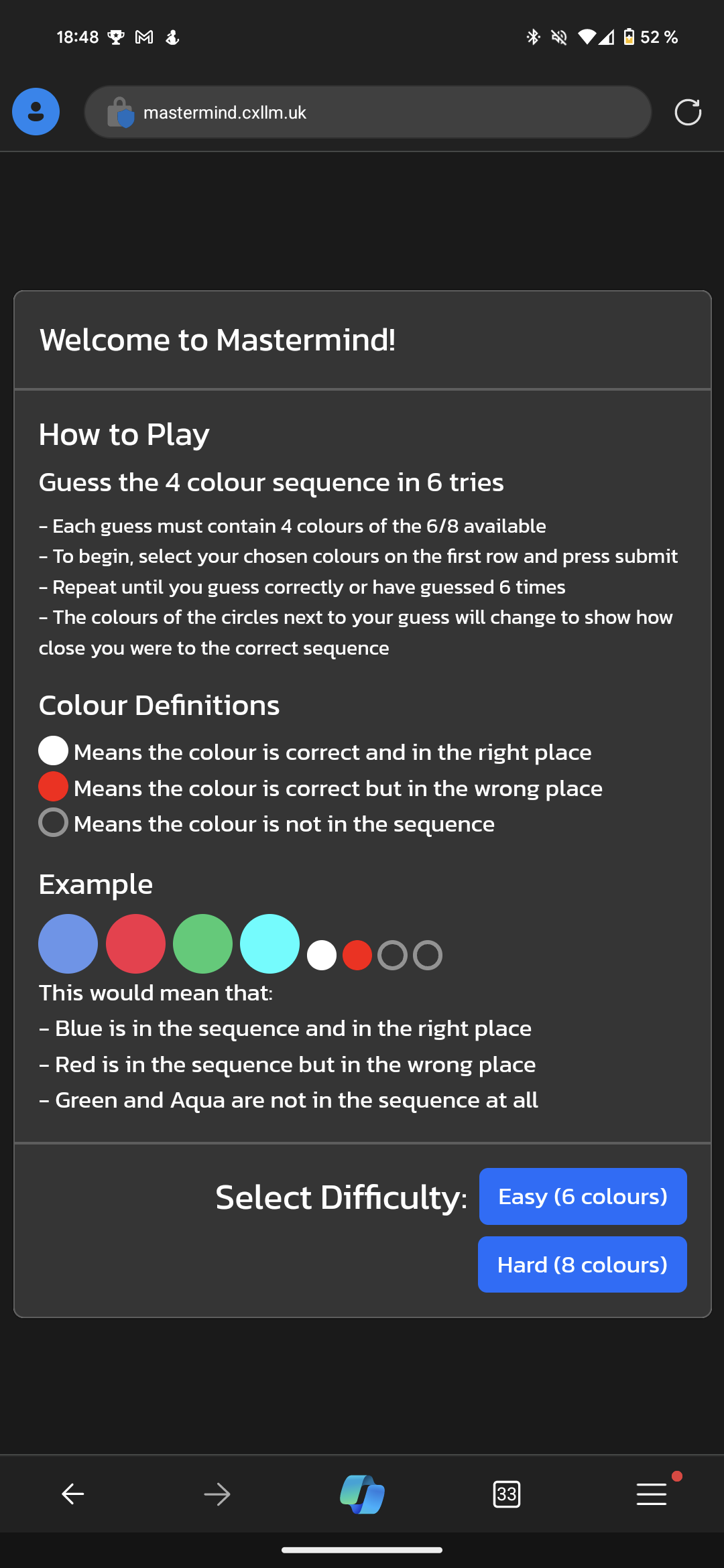 The way it works is similar to the way the game Wordle (New York Times) works. The player has to guess a randomly-generated 4-colour sequence across 6 guesses. There are 6/8/10 colours that can be included in the sequence and colours can be repeated in a sequence.
