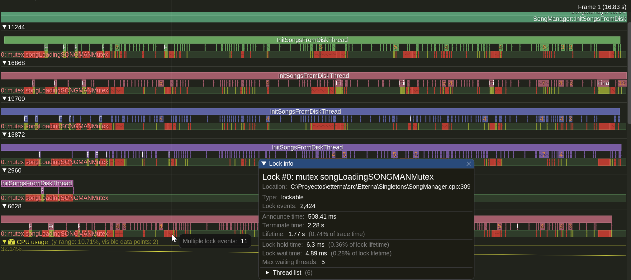 Some nice benefits of using this compared to a more traditional profiler is that it is frame-aware, and it lets us give a section of code within a function a name and track is separately without having to move it to a separate function. And it supports lua. It also runs on release mode and I found it much nicer to use compared to the sluggish vs profiler (and compared specifically to the vs sampling profiler, it's numbers should be more accurate. Tracy claims to be nanosecond accurate)