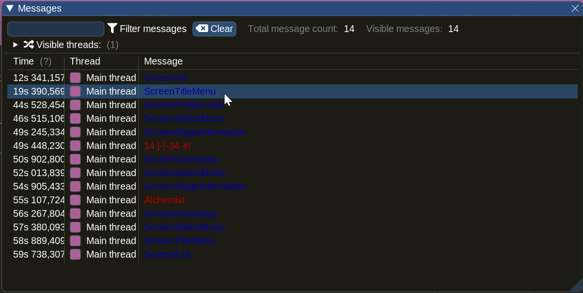 It also supports "messages", which lets one easily find frames where certain events happened. Currently I made it send a message for screen transitions and the chart name when we start gameplay for a chart: