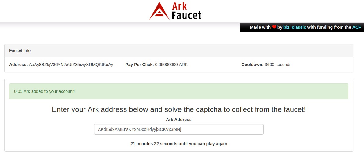 node- The IP address of the Ark node the backend will use to query Ark's blockchainport- The port the server will listen onpayPerClick- How much Ark to credit users per use of the faucetcooldown- How long users have to wait before using the faucet again (in seconds)paySchedule- When the faucet automatically pays out, in cron formatpayMinimum- The minimum balance users must accrue before they are paid outtxFee- The transaction fee to be subtracted from users' payouts. Set to 0 if you want to pay their transaction fees.log- Filename of log filedatabase:username- MySQL usernamedatabase:password- MySQL passwordrecaptcha:siteKey- ReCaptcha site keyrecaptcha:secretKey- ReCaptcha secret key
