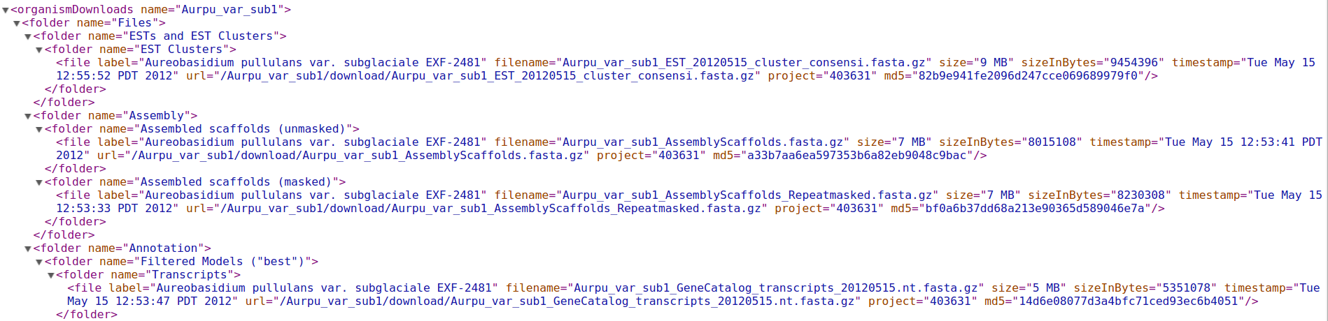 In brief, jgi-query begins by using cURL to grab an XML file for the query text. The XML file describes all of the available files and their parent categories. For example, the file for Aureobasidium subglaciale (JGI abbreviation "Aurpu_var_sub1") begins: