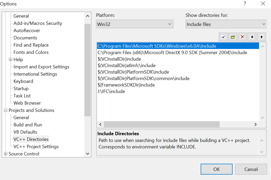 - Adicionar a pasta include do SDK 6.0A, Directx e IFC na parte de "Include Files"