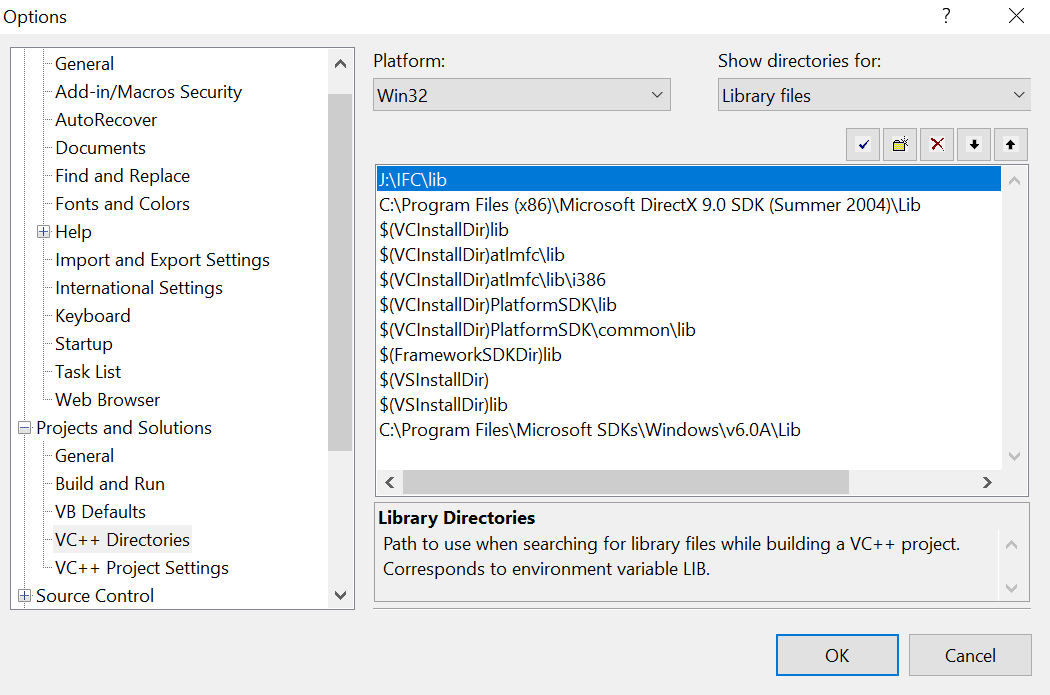 - Adicionar a pasta Lib do SDK 6.0A, Directx e IFC na parte de "Library Files"