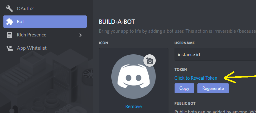 From there the "Click to Reveal Token" text will be displayed. Once you click that it will give you a text string. This will be pasted into the first property of the config.json.