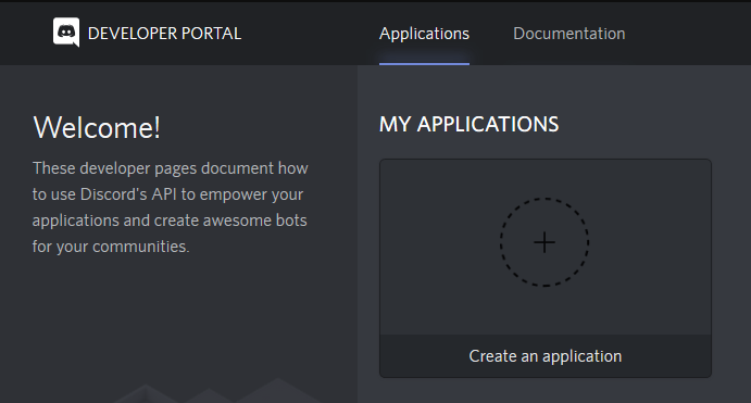 Here you will need to click on the "Create an application button". You will need to fill out the name of your bot.