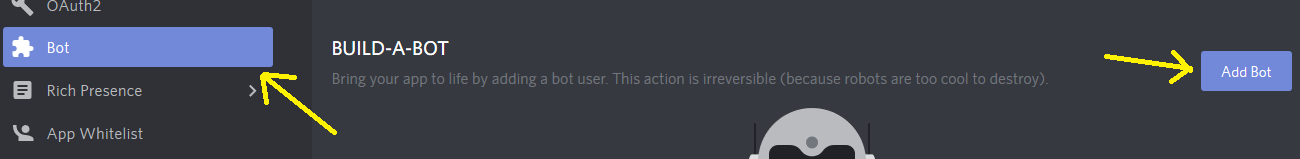 Once that is completed you will want to click on the "Bot" tab on the left side menu. From there you will need to click on the "Add Bot" button to turn the newly created application into a bot.