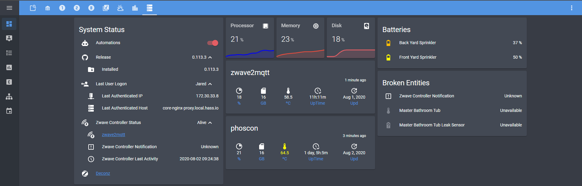 - The System view shows the docker host status, version & firmware information, batteries, and signal strengths.