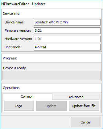 - Firmware Updater, universal for all Joyetech, Wismec, Eleaf, etc devices;