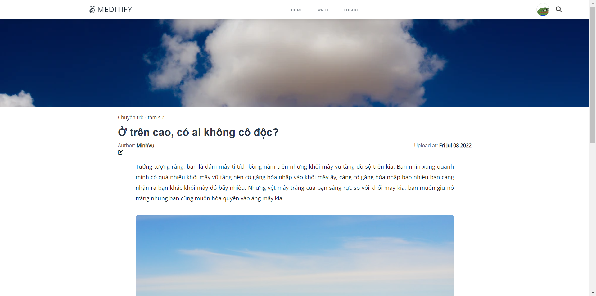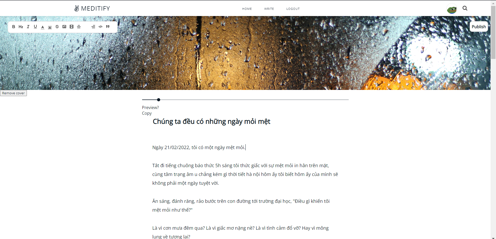 Meditify A blog platform inspired by Medium and Spiderum Home Page Reading Place Login Editor Main Feature Register, Login, Logout Create Post, Edit post, Delete post Search Post by tags, author Future Main Feature Edit account Upvote, comments Custom styling css for any user to read