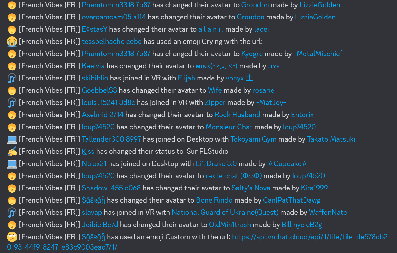 spaghetti js server for handle all stuff from my custom osc vrcx ! You need water to use this ! If you don't have any water it will just not work and vrcx will give you no logs ! this was made 6 month ago in like 1 hour since i needed something to get logs on discord for friends and show what is going on in my rooms and can also help friends detect easly crashers etc
