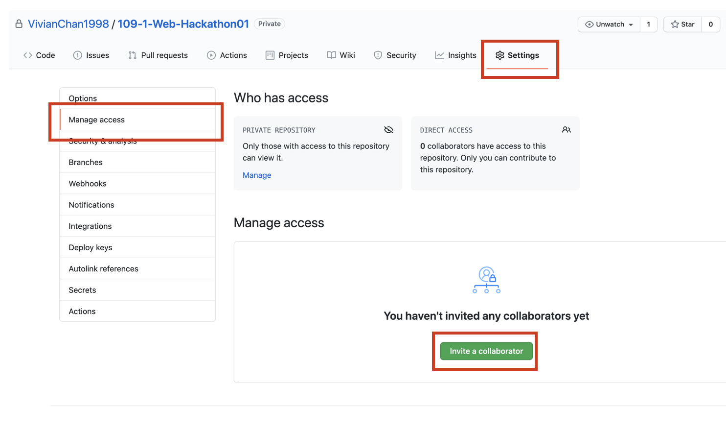 Set the project to Private and name it as 109-1-Web-Hackathon02. DO NOT select a template
