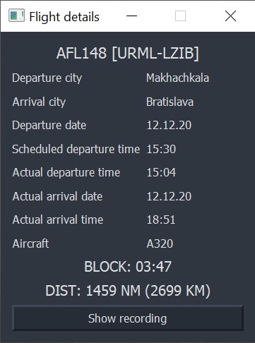 And also, the program can show you how you were flying, i.e. it shows all coordinates you've overflown. To start collection of coordinates, you'll have to 'open' the flight before departing. X-plane will continuously send coordinates to the program via UDP on port 50000 (it have to be configured in X-Plane to send lat and lon to specified port) until you press 'close the flight' button in schedule.
