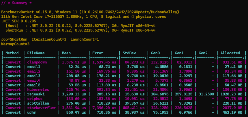 Or check out the latest automated perf test results here: https://pavlosmcg.github.io/Html2Text.Net/dev/bench/