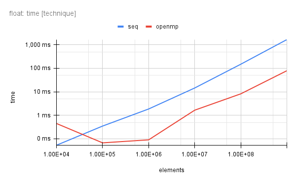 Comparing performance of sequential vs OpenMP-based vector element sum.