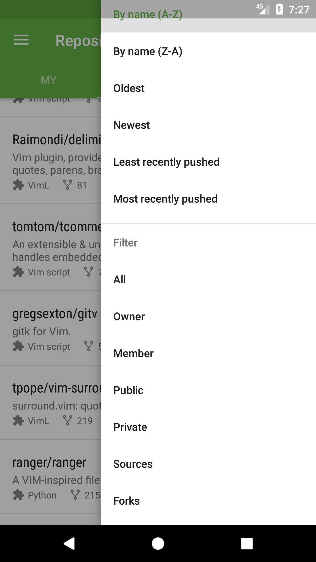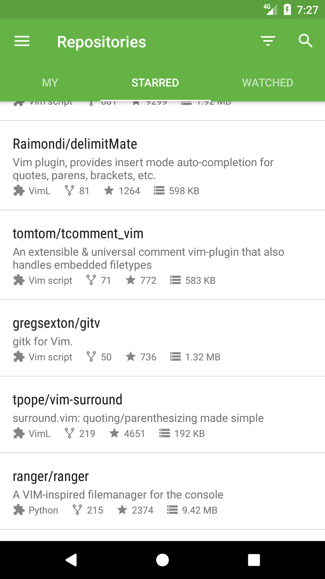 As for the confusion, I'd suggest keeping the sort order intact when switching between tabs (have a single sort order selection for all 3 tabs) and only hiding the filter options on the starred and watched tabs (as those have an implicit filter set). As for the tabs themselves, I'm torn. On one hand I don't like 'tabifying' of stuff if not strictly needed, but on the other hand there's a significant amount of people who currently struggle to find the starred repositories, so this is certainly an improvement. The only other option that comes to my mind is adding multiple entries to the drawer, but the multiple tabs approach probably fits better into our current model (see e.g. the 'My gists' section), so it's fine, I guess :) |