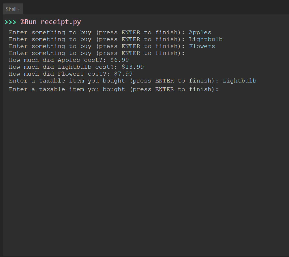 This project consists of simple lists and while loops in Python that will ask the user for purchased items, the prices, and which items were taxed. It will print these out in a format similar to a receipt detailing your purchase on a piece of thermal paper, including the subtotal, tax (based on Newfoundland tax percentages), and total cost.