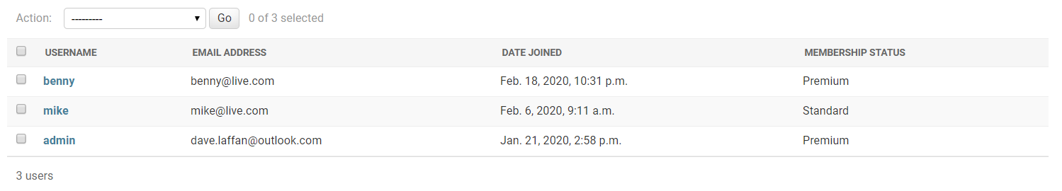 Additionally, a 'Membership Status' column has been added to the user overview page. There is no membership status field in this model, this is handled by Django User Groups, so this had to be defined in the admin.py file for the accounts app.