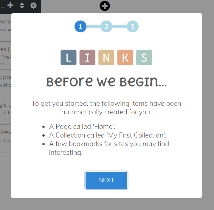 A change to what a new user sees when first logging in after registering an account. Previously, new users were greeted with a brief message at the top of screen informing them a page had been created for them, and to create a collection before trying to add a bookmark. Now, when a new user logs in for the first time, a modal window opens in the middle of the screen and shows this: