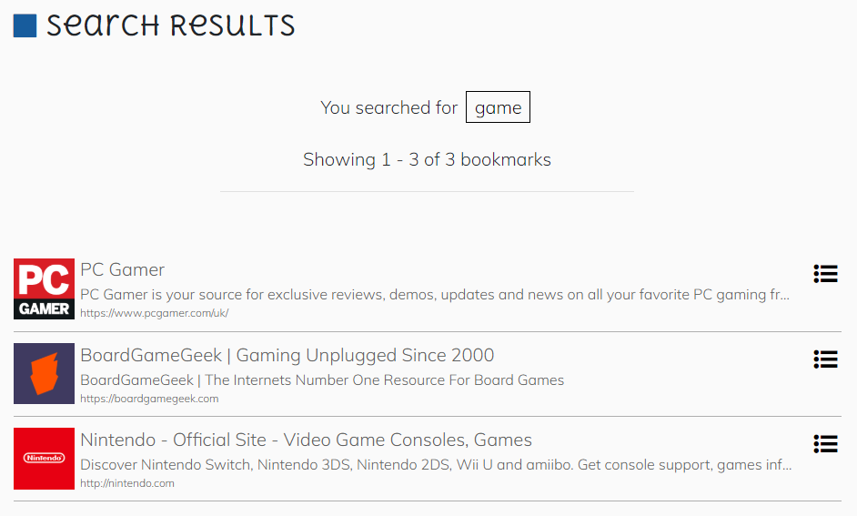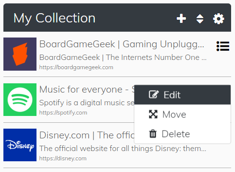 - The main app page. This is where users can view, add, edit, organise, and delete their bookmarks.