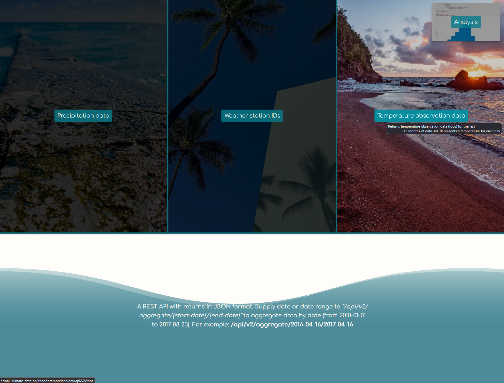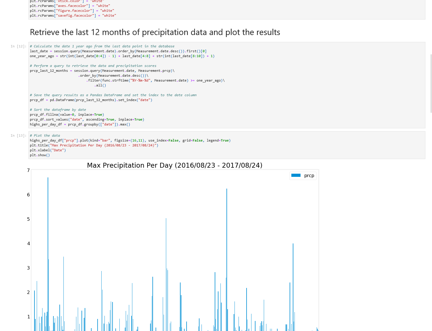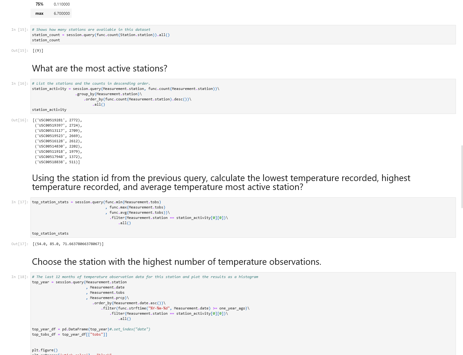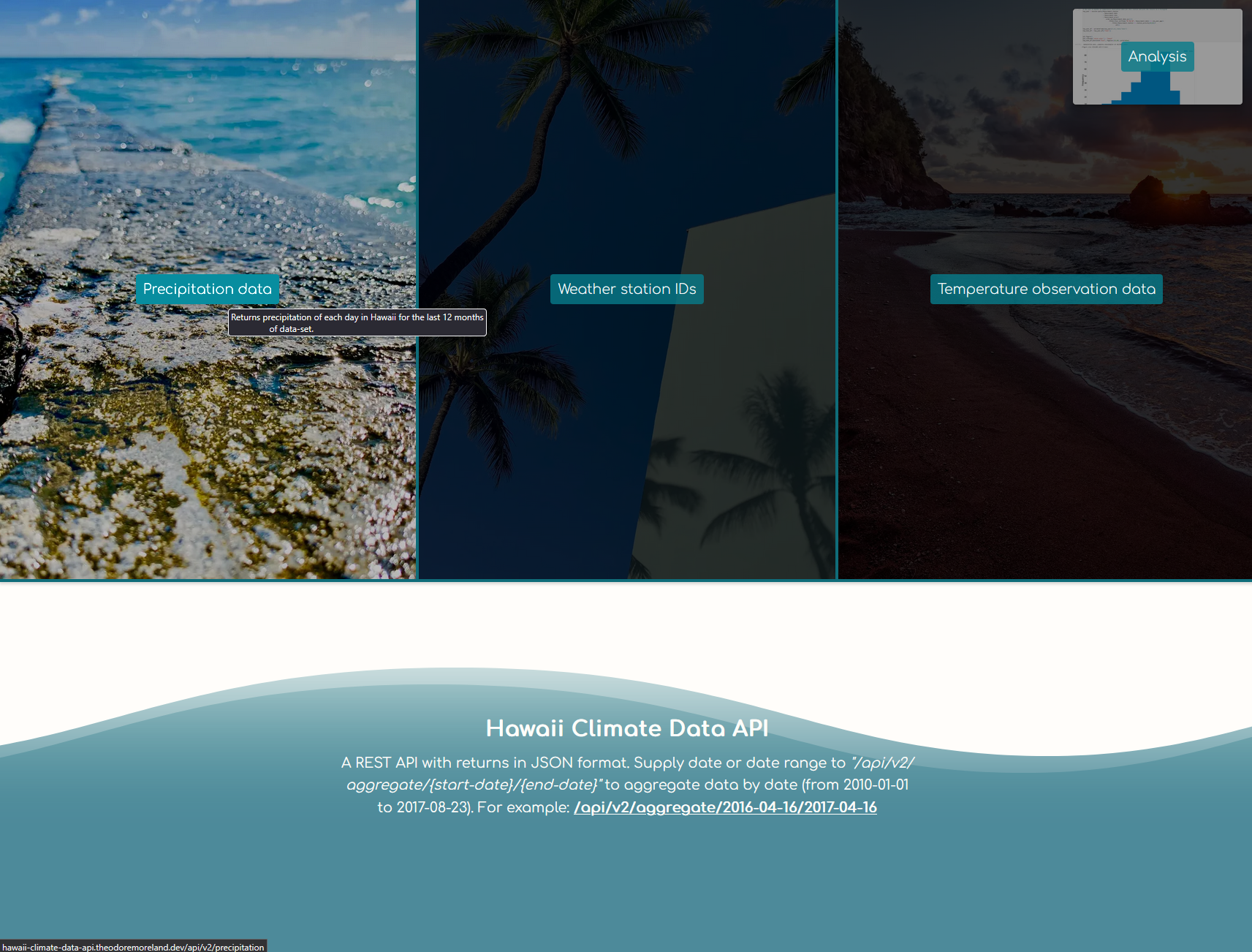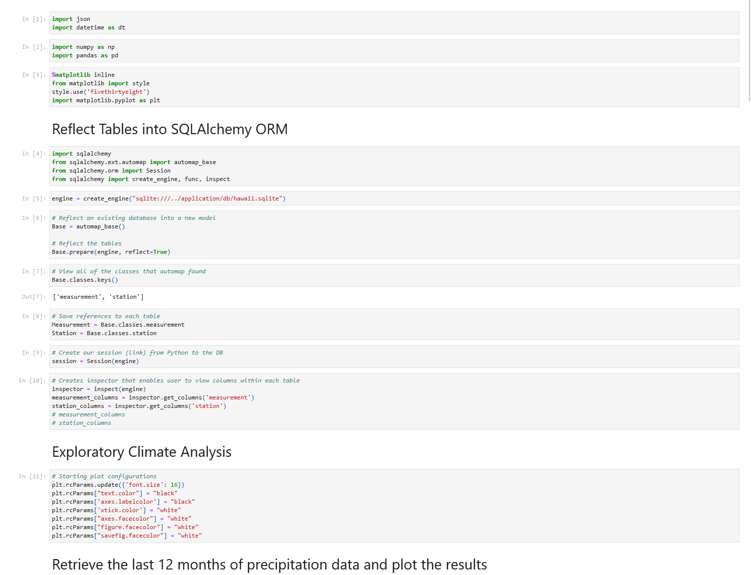 For this project, I used Python to perform analysis on a climate database before mapping said database to a custom built REST-API. The database features Hawaii Climate data between 2010-01-01 and 2017-08-23. I used Python and SQLAlchemy to do climate analysis and exploration on a hawaii.sqlite database, all analysis was completed using SQLAlchemy ORM queries, Pandas, Matplotlib, and Jupyter Notebook. The REST-API was developed using Python (Flask).