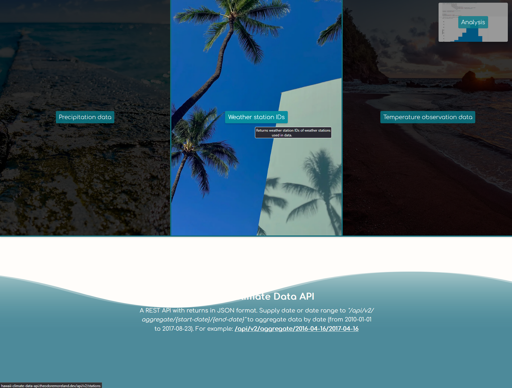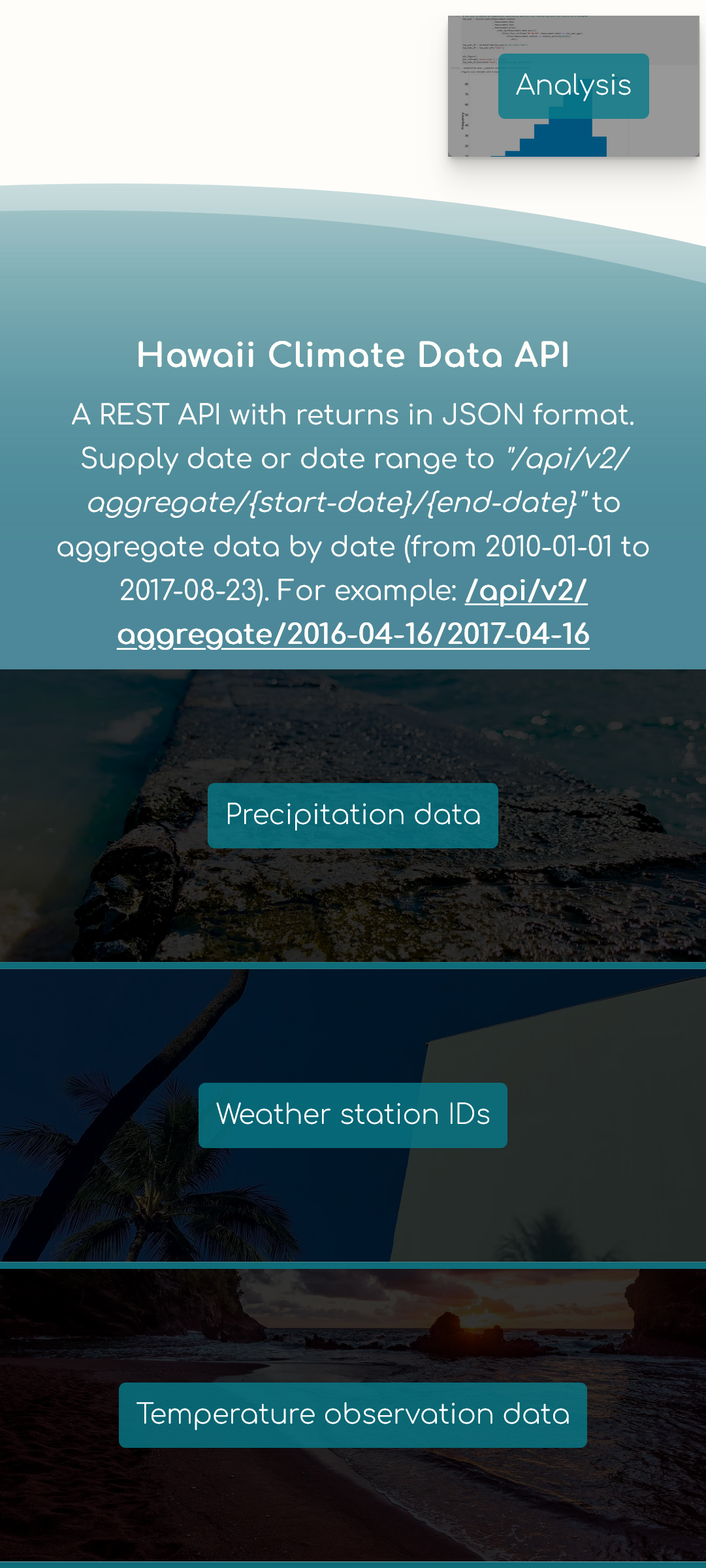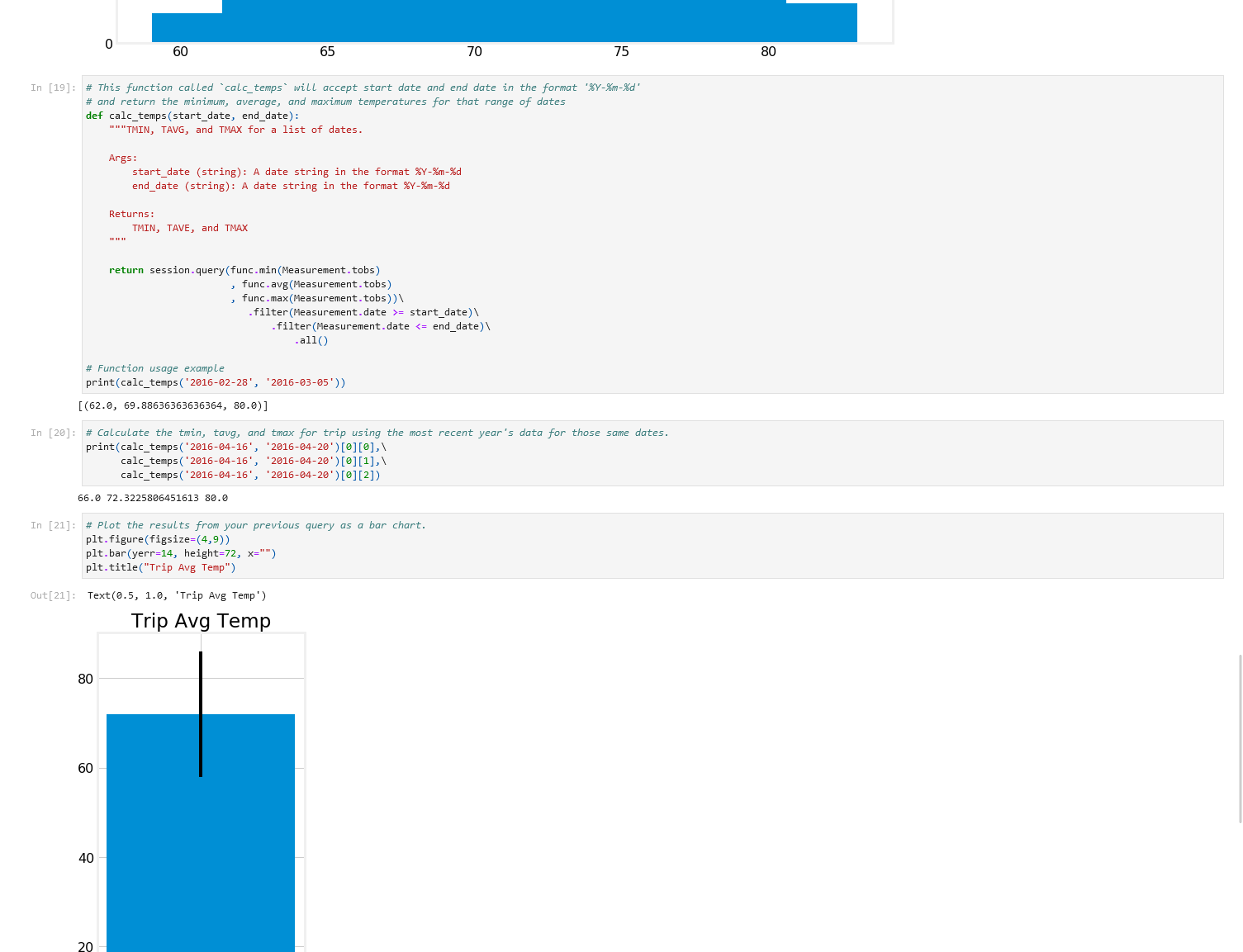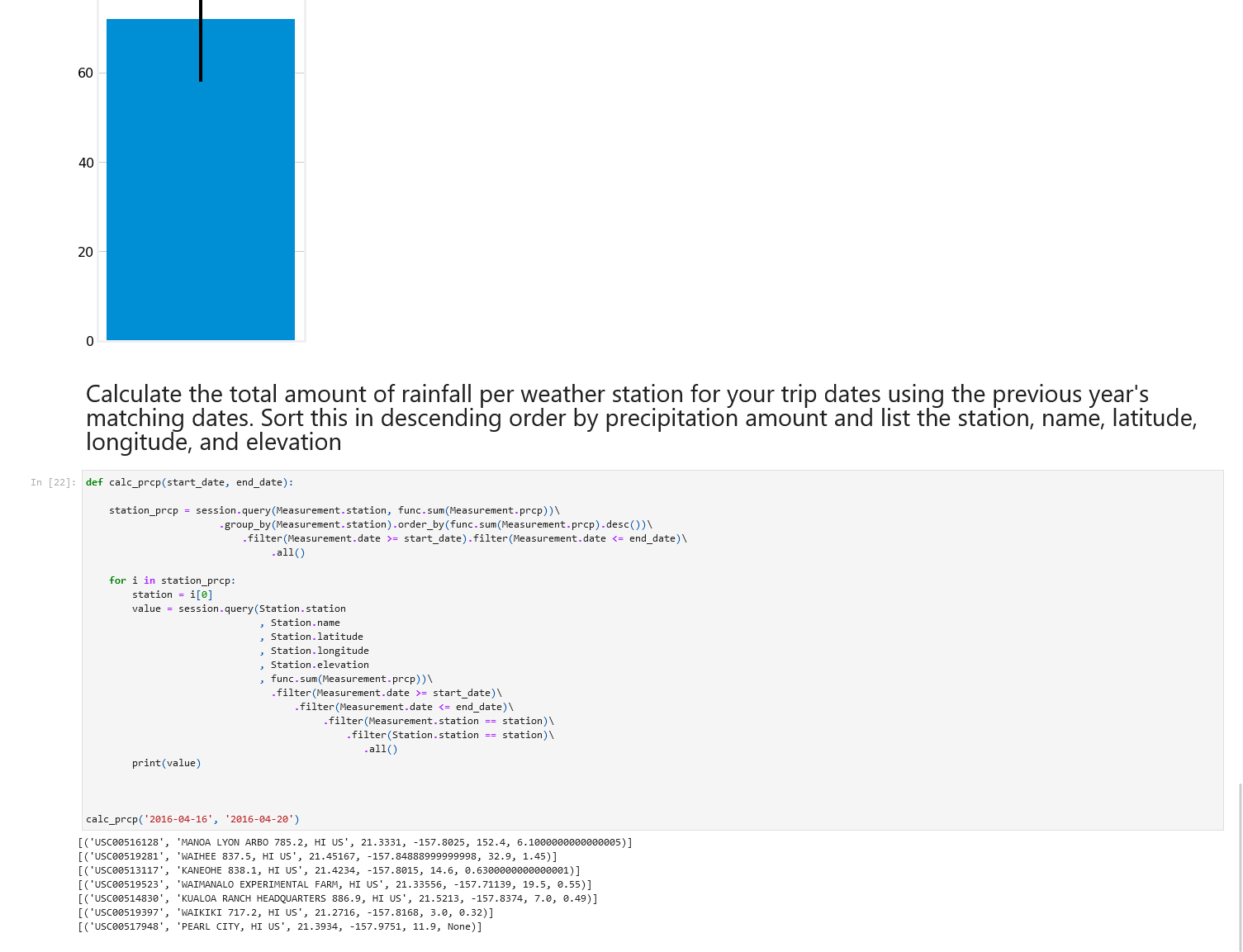 For this project, I used Python to perform analysis on a climate database before mapping said database to a custom built REST-API. The database features Hawaii Climate data between 2010-01-01 and 2017-08-23. I used Python and SQLAlchemy to do climate analysis and exploration on a hawaii.sqlite database, all analysis was completed using SQLAlchemy ORM queries, Pandas, Matplotlib, and Jupyter Notebook. The REST-API was developed using Python (Flask).