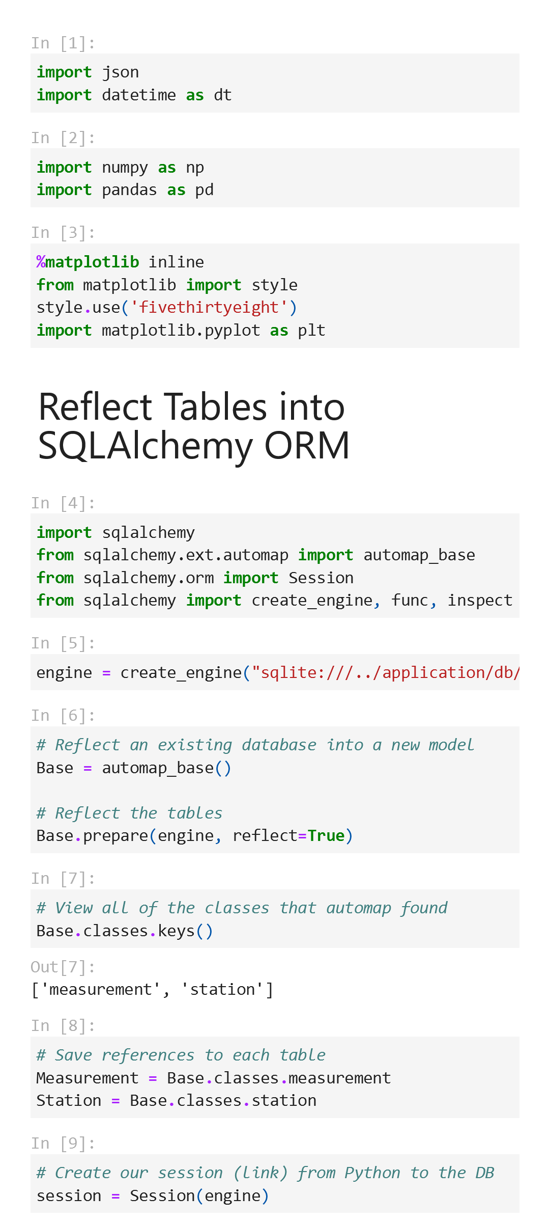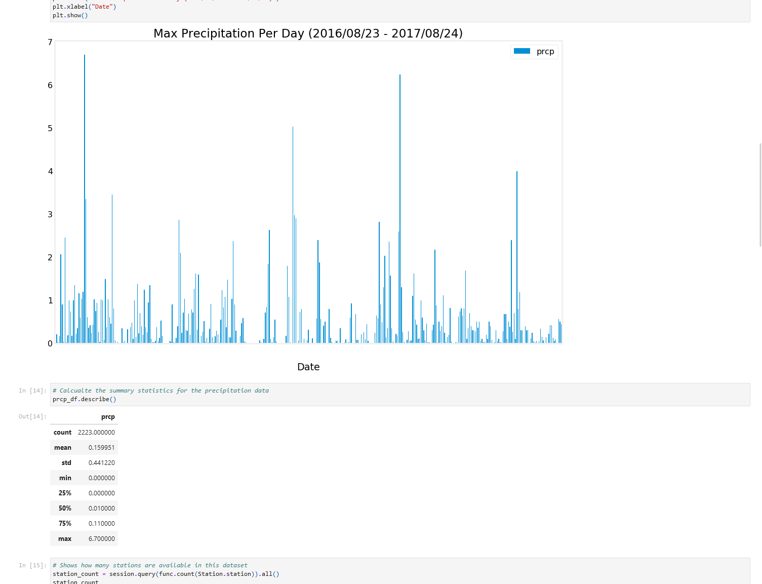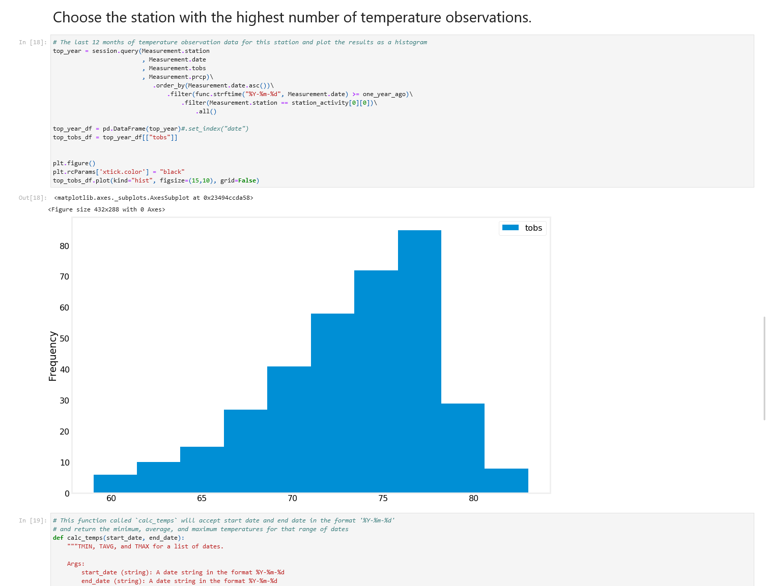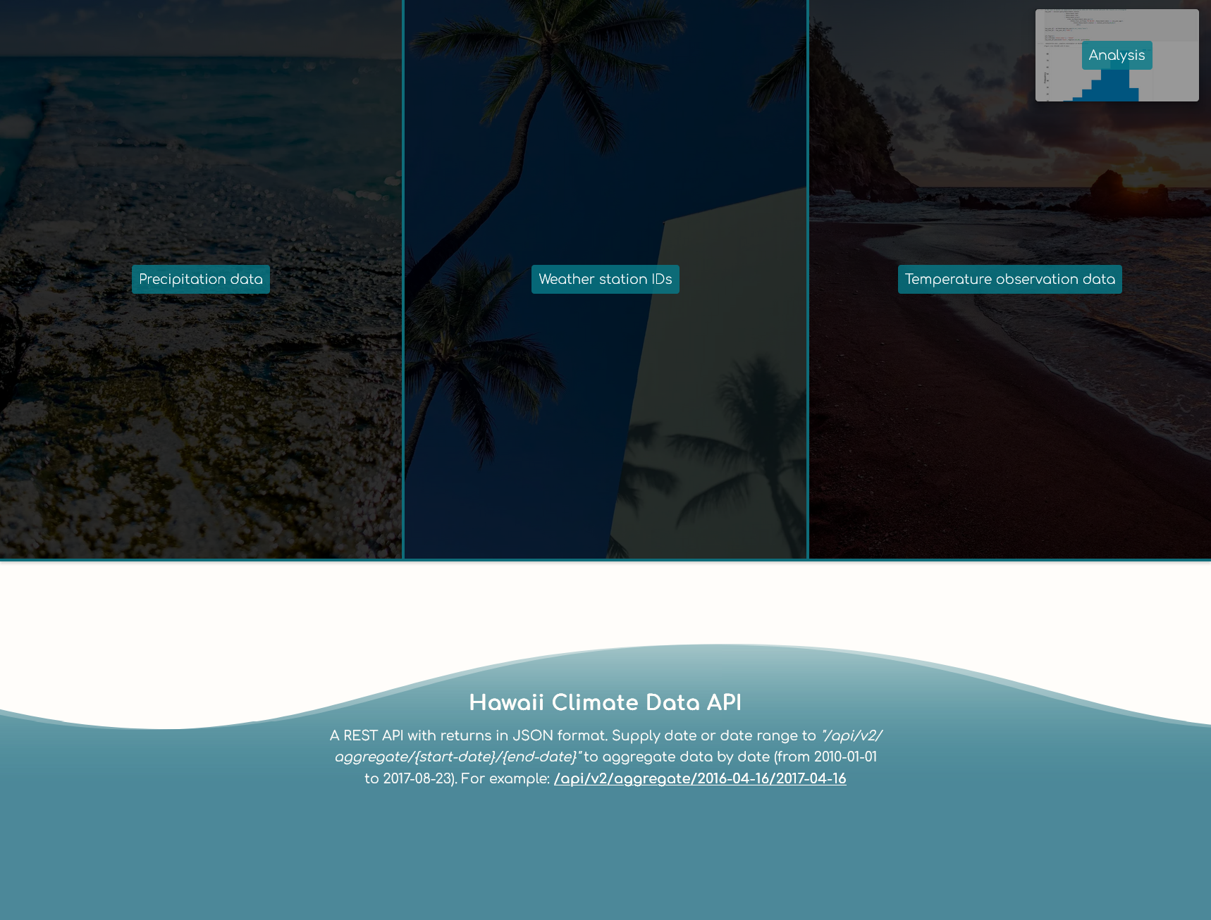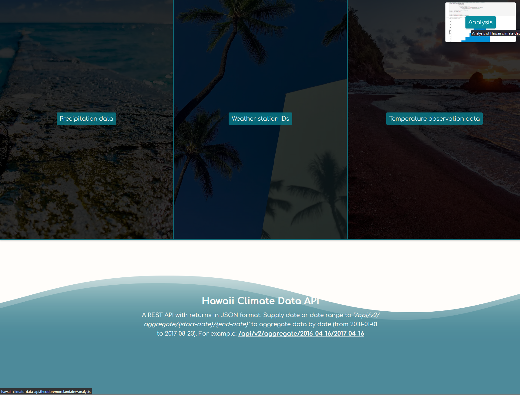 For this project, I used Python to perform analysis on a climate database before mapping said database to a custom built REST-API. The database features Hawaii Climate data between 2010-01-01 and 2017-08-23. I used Python and SQLAlchemy to do climate analysis and exploration on a hawaii.sqlite database, all analysis was completed using SQLAlchemy ORM queries, Pandas, Matplotlib, and Jupyter Notebook. The REST-API was developed using Python (Flask).