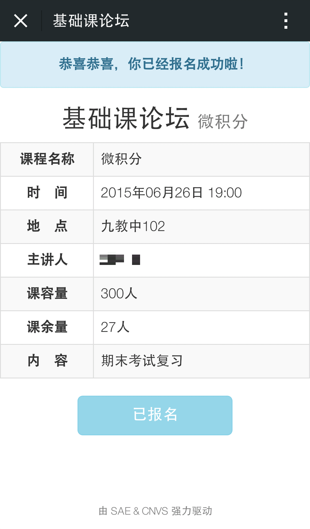 该项目由本人独立完成,也是本人首次使用 PHP 编写的上线项目。2015年05月27日,校内微积分讲座预约上线,课容量250人,40分钟内预约已满,SAE 统计的访问量 PV 为2573,微信公众号新增用户160人。